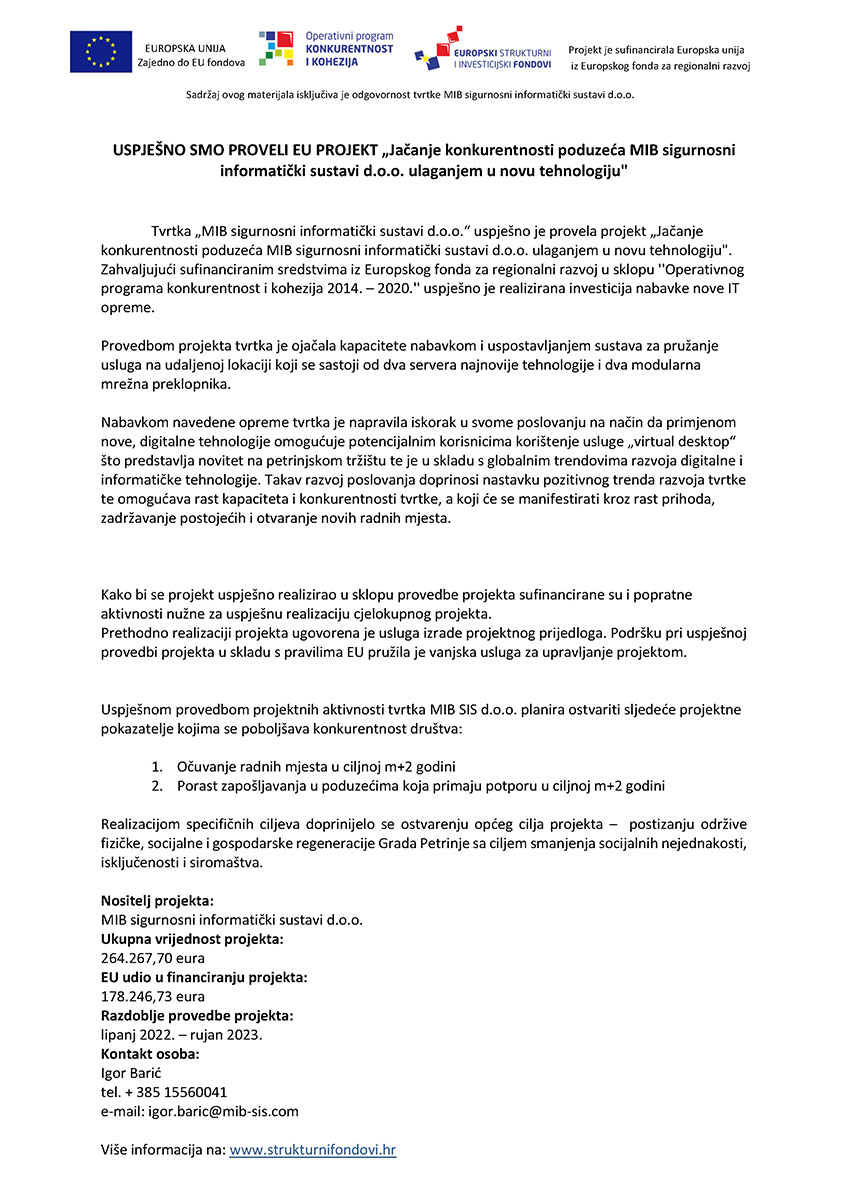 Naziv projekta: Jačanje konkurentnosti poduzeća MIB sigurnosni informatički sustavi d.o.o. ulaganjem u novu tehnologiju